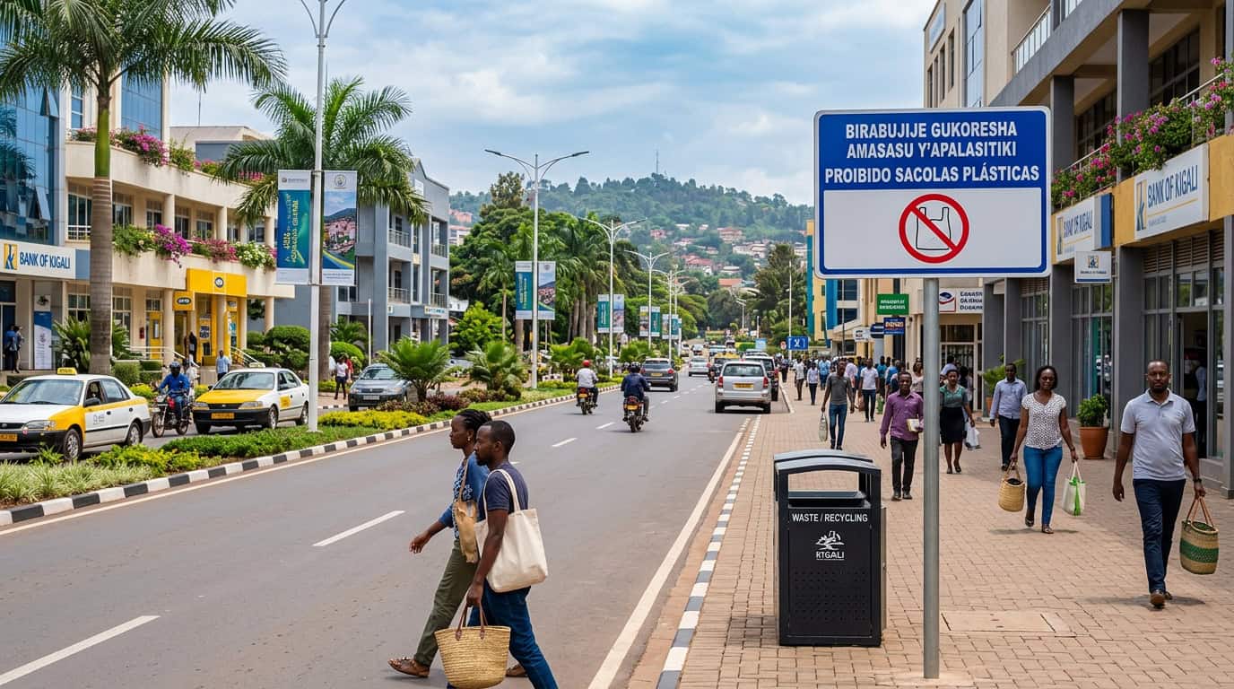 Desde 2008, Ruanda impôs a proibição total da produção, importação, venda e uso de sacolas plásticas não biodegradáveis em seu território. Essa legislação rigorosa se aplica a todos os setores da economia, sem exceções.